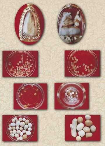 आचार्य मन के शरीर का दाह संस्कार के बाद एकत्रित हड्डी के टुकड़े अब विभिन्न पारदर्शी और अपारदर्शी रंगों में क्रिस्टल जैसे अवशेषों में परिवर्तित हो गए हैं।