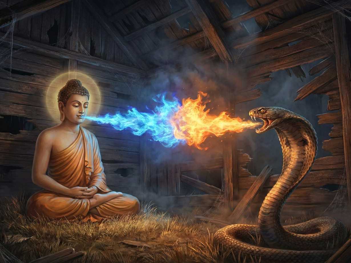 जब नाग ने भगवान को बैठा देखा, तो उसने नाखुश होकर धुआँ ऊगला। तब भगवान ने सोचा, “मुझे इस नाग को वश करने के लिए अग्नि विरुद्ध अग्नि का उपयोग करना चाहिए, ताकि उसकी त्वचा, माँस, नसें, हड्डी या अस्थिमज्जा आहत न हो।”